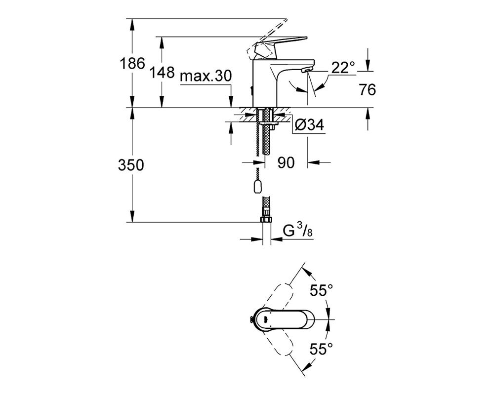 Grifo monomando para lavabo tamaño S con tragacadenilla con tecnología GROHE SilkMove. Medidas: 14.8x9x18.6 cm.