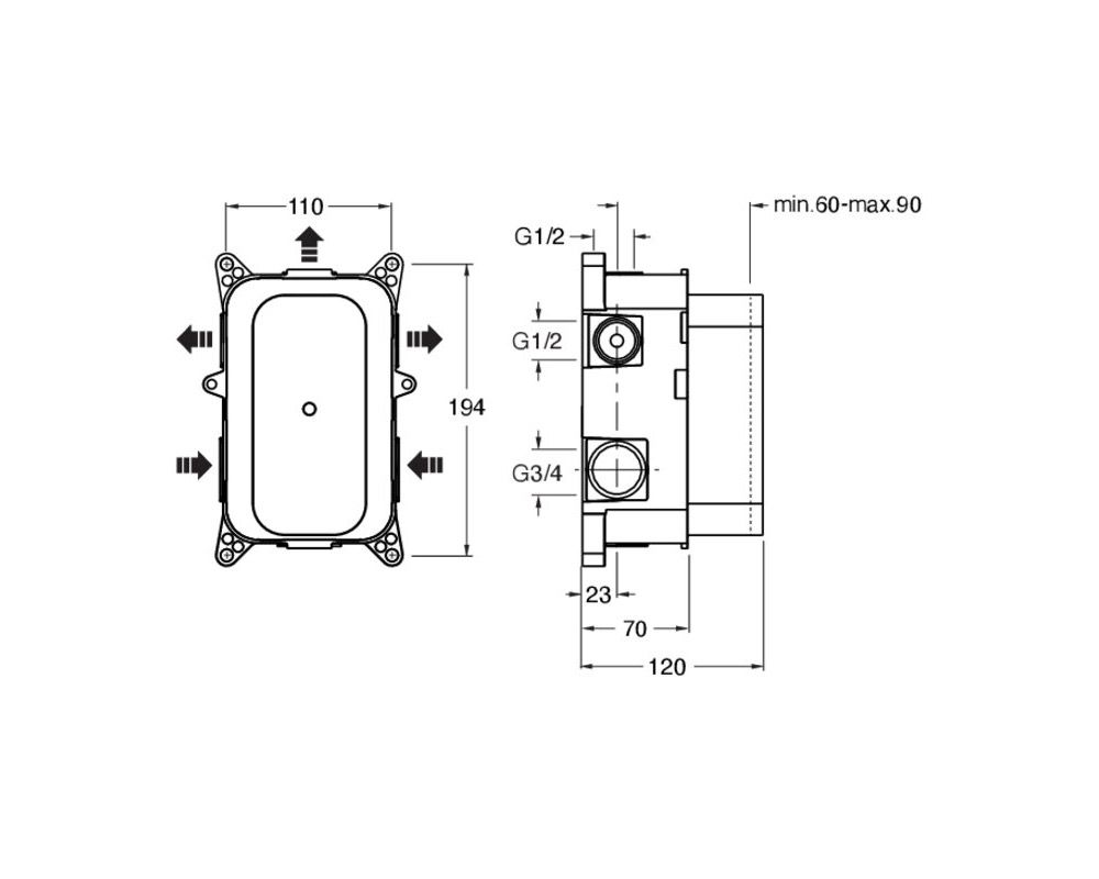 Conjunto integrado para mezclador de ducha/bañera mural, 2 entradas de 3/4", mezcla termostática, con parte mecánica.