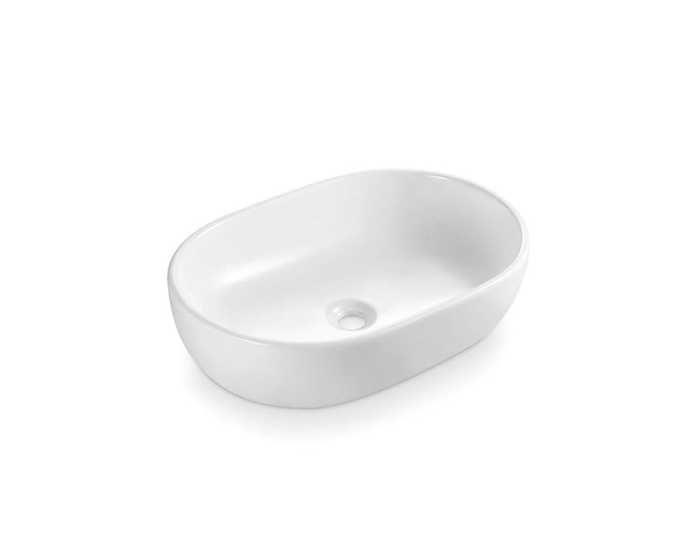 Lavabo semi-ovalado de porcelana para instalación suspendida. Medidas: 60x38x9 cm.